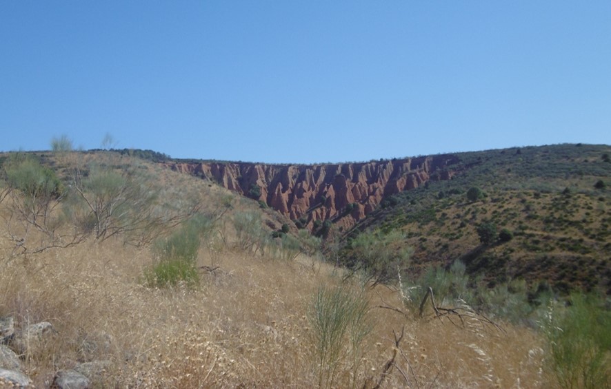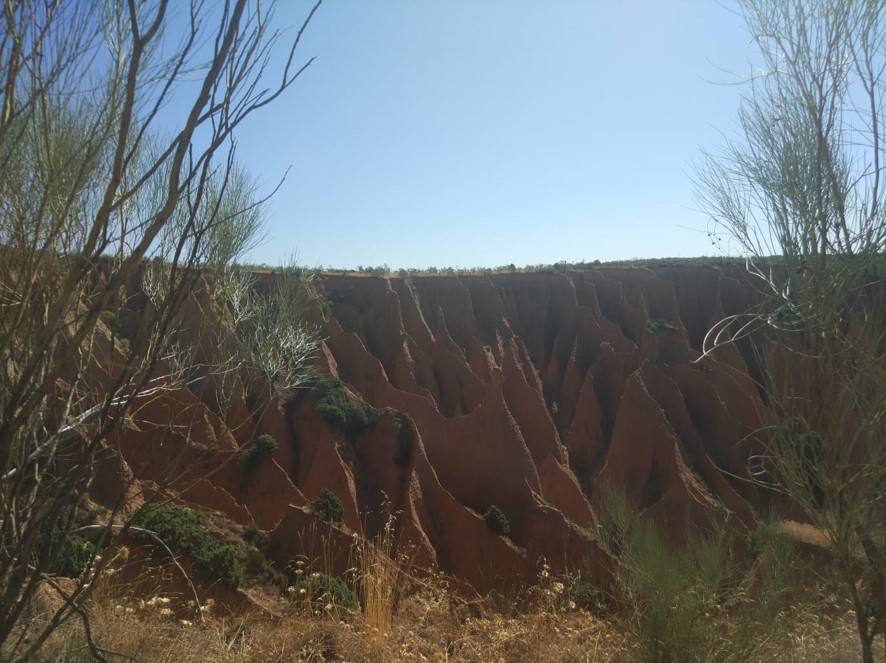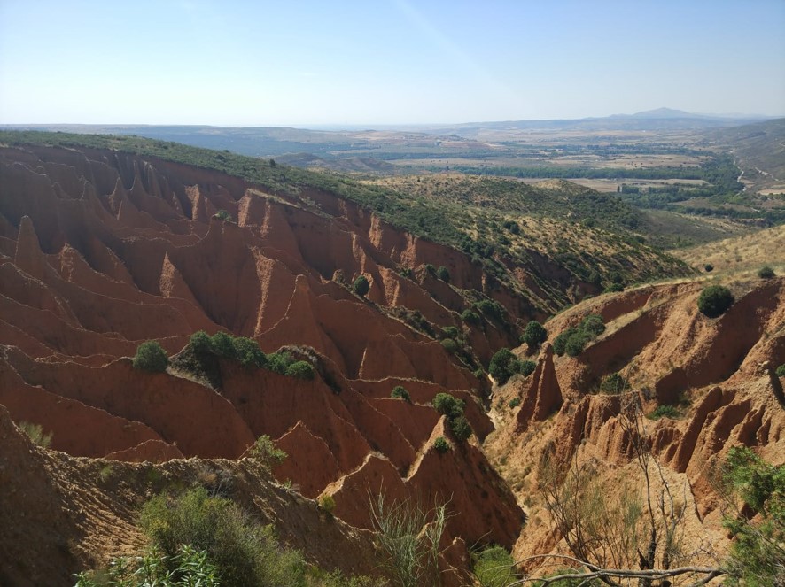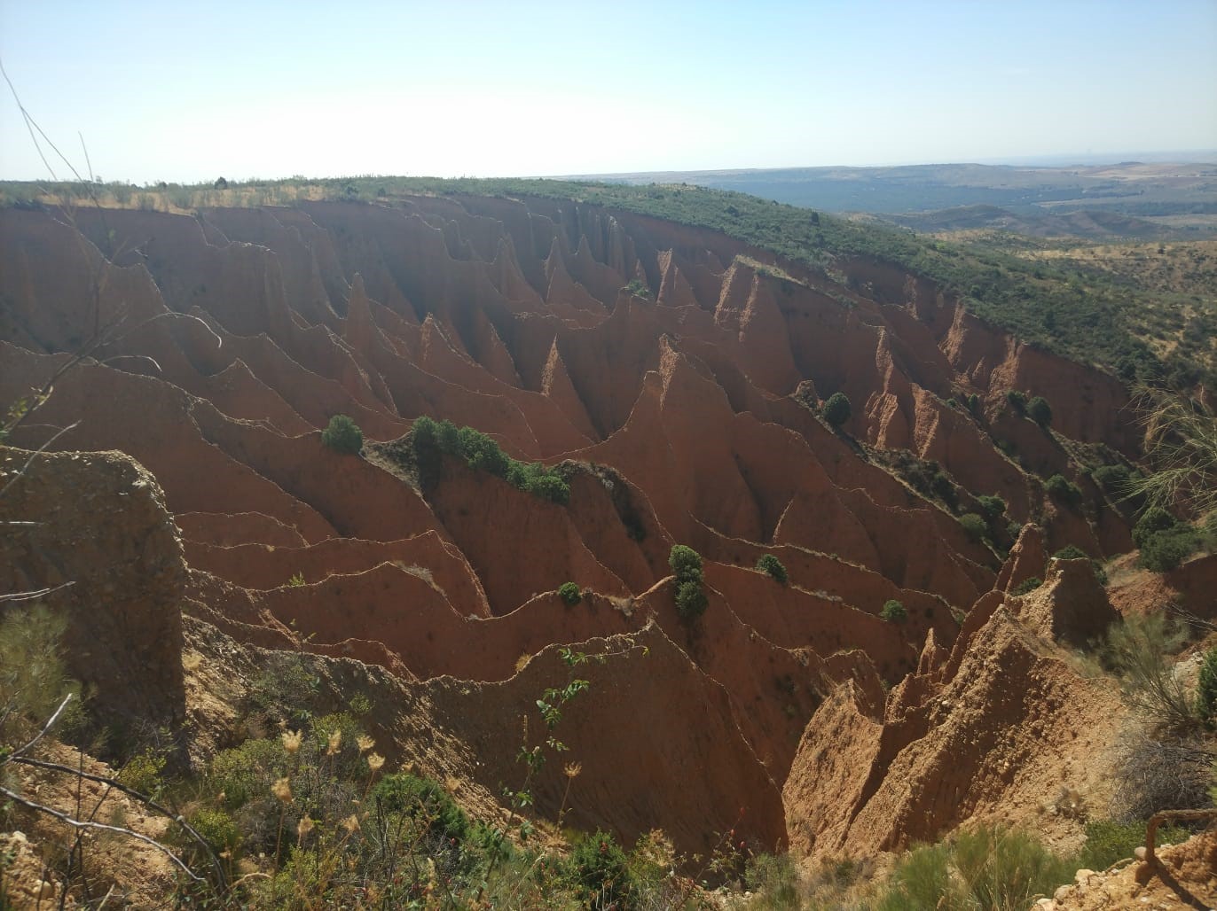 El camino rodea desde la altura las Cárcavas, pudiendo visualizarlas desde distintos ángulos. Pasamos un rato contemplando estas curiosas formaciones de tierra roja: se trata de un terreno arcilloso, muy vulnerable a la erosión, que contiene una combinación de materiales duros y blandos, lo cual ha dado lugar a la formación de torreones, en cuyos vértices se encuentra el material duro que no ha sido arrastrado por el curso de agua de lluvia; a estos torreones se les conoce como chimeneas de hadas (turismo.patones.net).