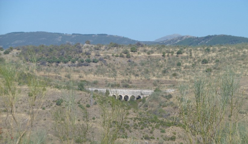 Tras recorrer un semicírculo cogemos un camino que sale a la izquierda y continuamos más adelante por una pista junto a un pinar. Aprovechamos la sombra de los árboles para hacer un descanso y disfrutar de un menú compuesto por jamón serrano, tomate y empanadas variadas, entre otras delicias. Después proseguimos nuestro camino, la pista se bifurca y continuamos por la derecha, bajando hasta una carretera muy desgastada. En este punto se encuentra el acueducto del Partenón (canal del Jarama).